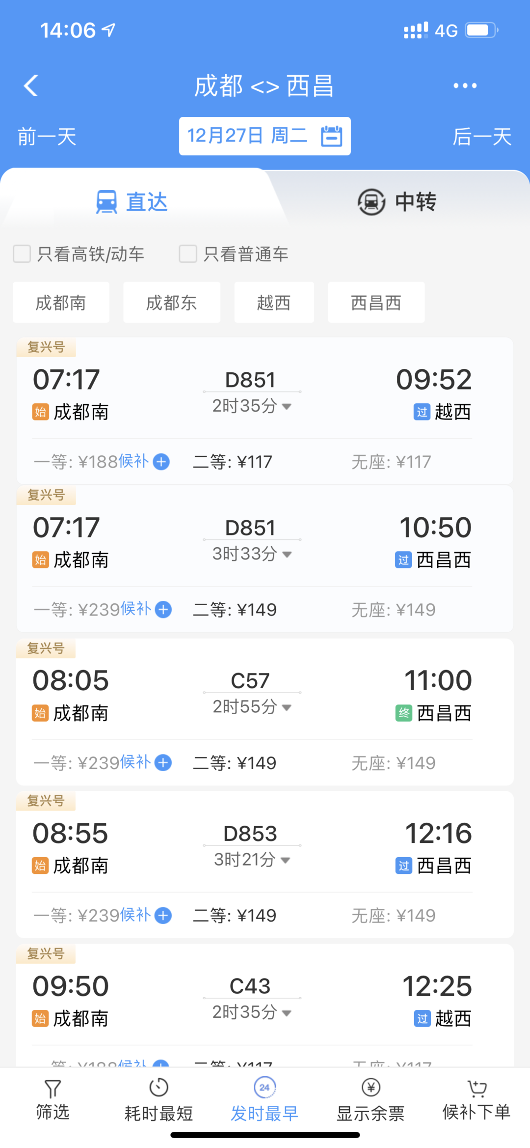 成都到西昌最快2小时55分,二等座149元、一等座239元!12月24日,即将全线通车的新成昆铁路车票在12306网站开售,成都到西昌、攀枝花等攀西地区铁路旅行时间大幅缩短。