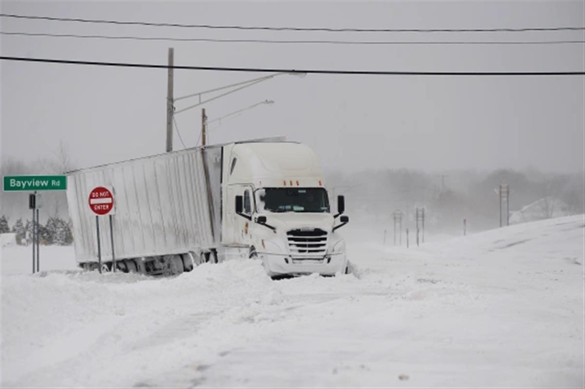 周六,纽约州一辆卡车被困在积雪中(图源:NBC)