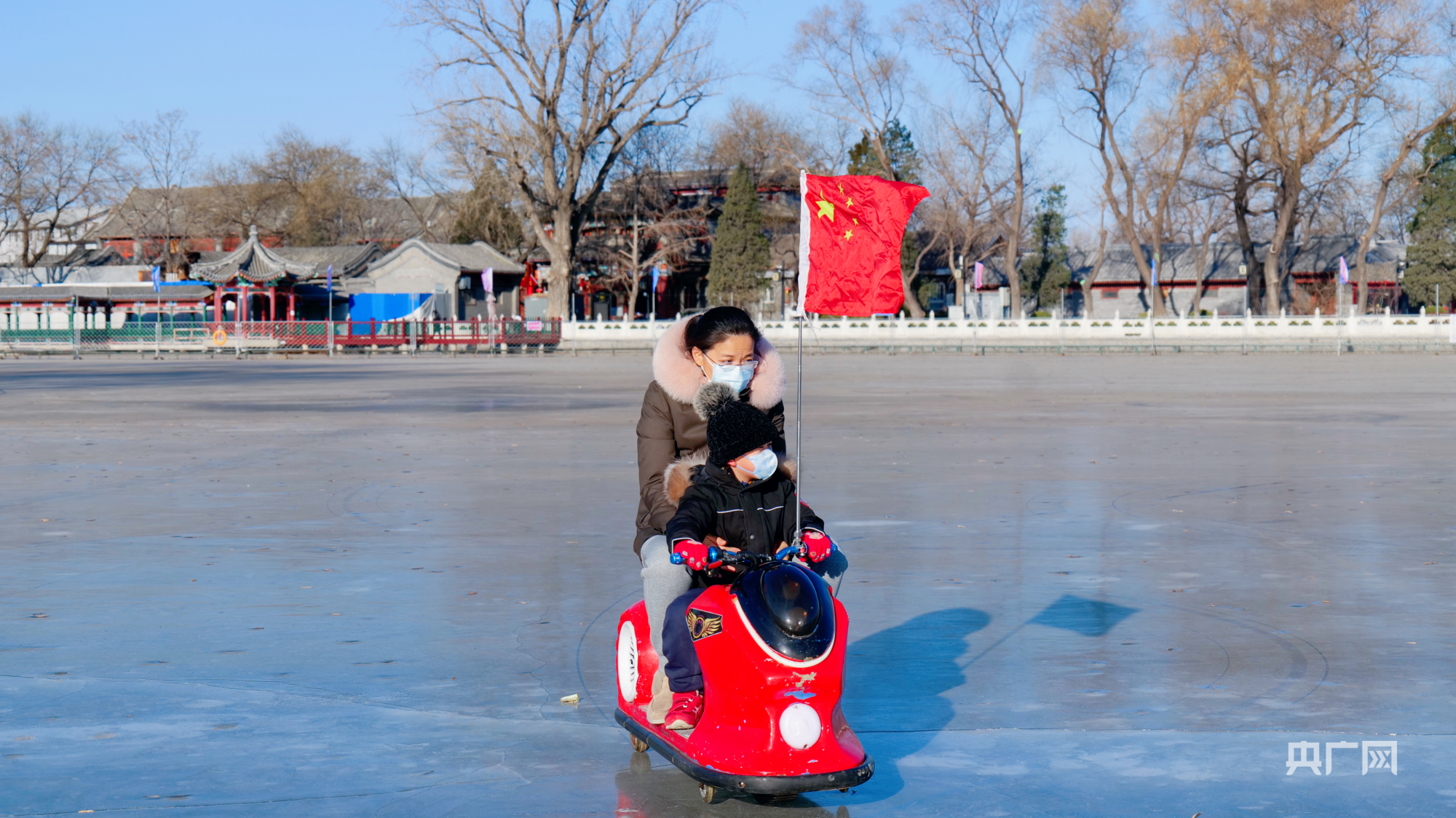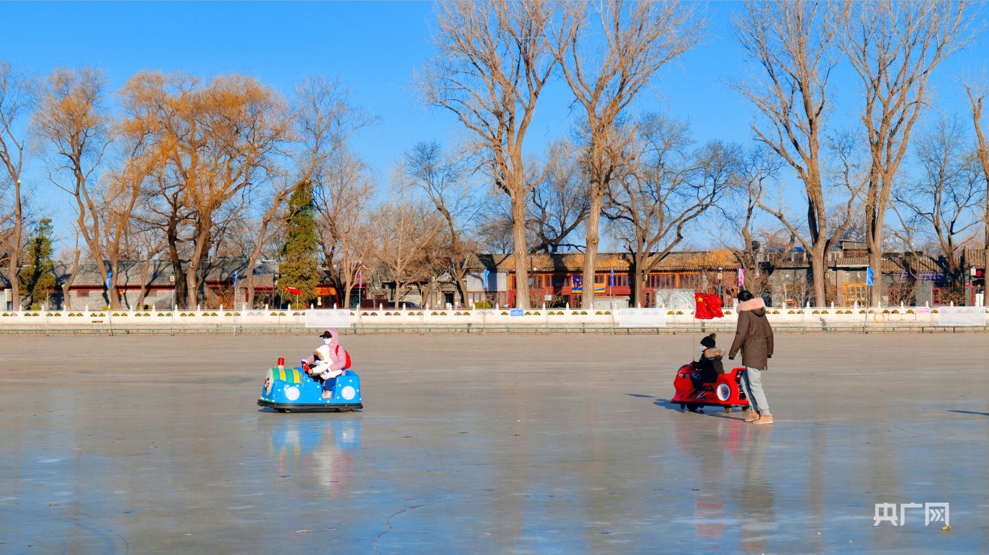 游客在什刹海冰场综合区体验冰车(央广网记者朱冠安摄)