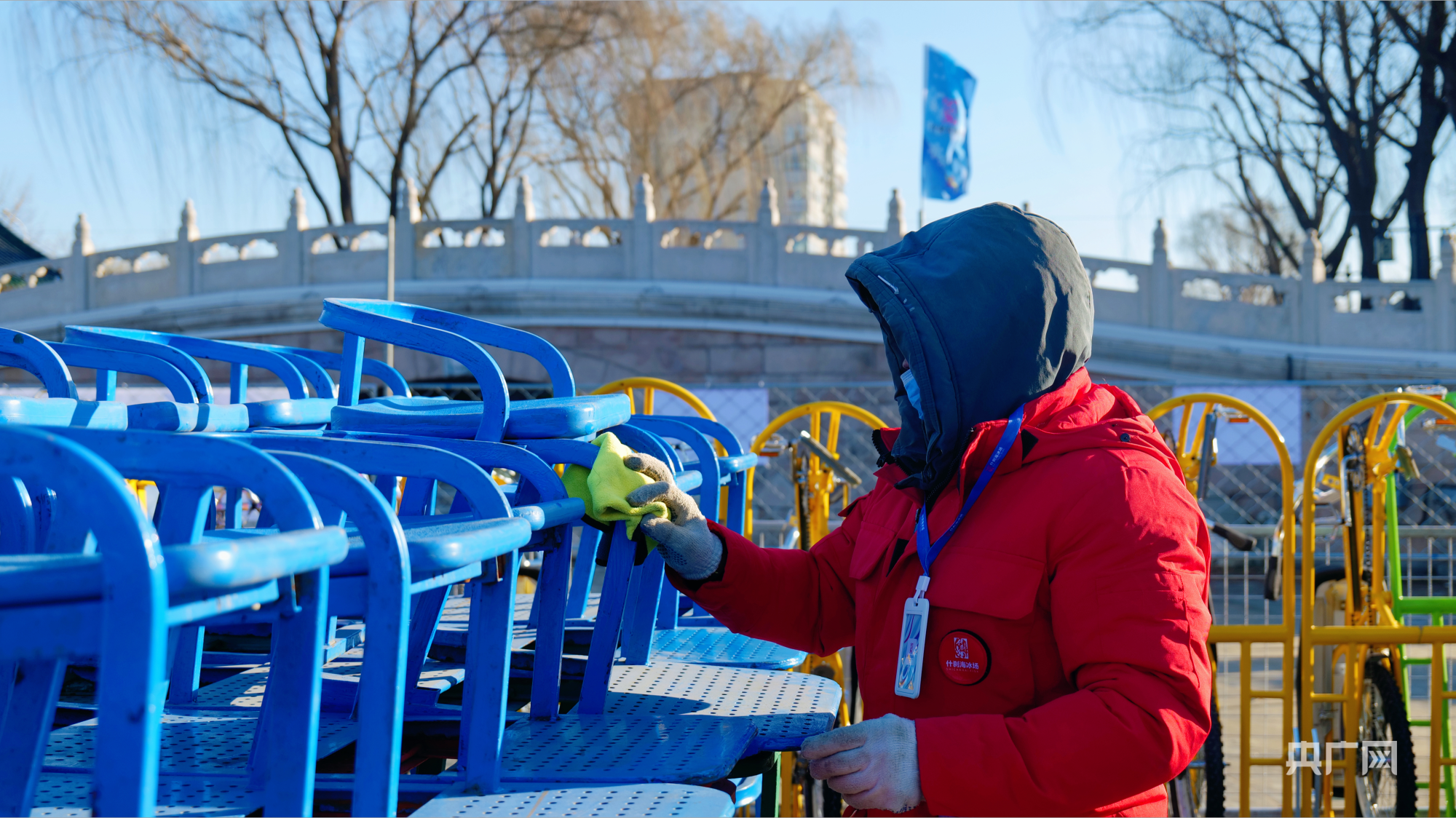工作人员在擦拭冰上娱乐设备(央广网记者朱冠安摄)
