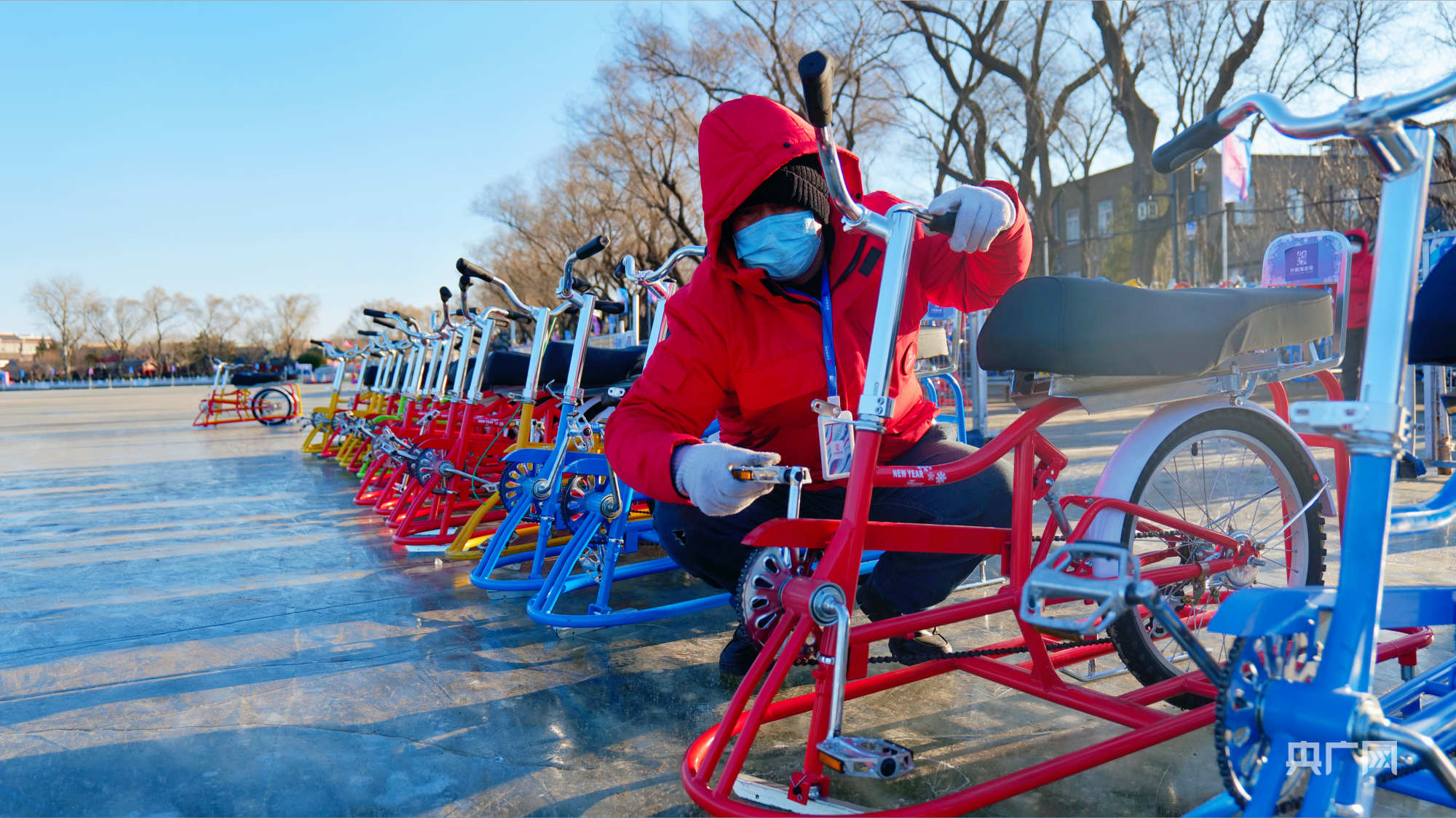 工作人员在检修冰上自行车(央广网记者朱冠安摄)