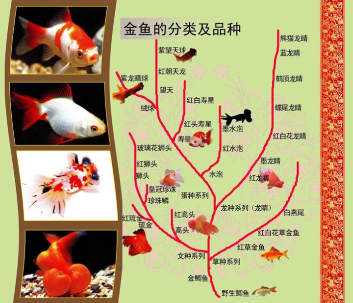人们把现在的金⻥,根据体型分为草种、文种、⻰种、蛋种、⻰背种等。金⻥的命名多根据金⻥的体型、体态、体色等特征,同时也透露出传统文化气息。“有的以传统祥兽瑞禽寓意,如⻰睛、凤尾、鹤顶、⻁头等;有的以生动的形态特征命名,如喜望天、玛瑙眼;有的直接借用词牌、曲牌名,如‘朝天龙’叫做‘喜朝天’,‘水泡眼’名为‘眼儿媚’。”