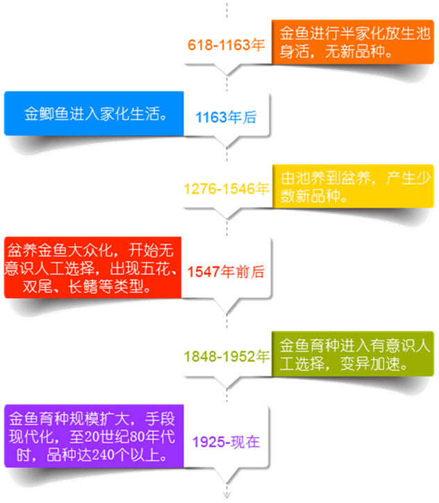 金⻥开始被有意识地人工选择,是在清朝后期。由于饲养技术的发展,⻥的变异增多,金⻥工匠有意识地选择奇异的品种进行繁育。在这一时期,金⻥的眼睛、鳞片、色彩、腮盖、头部、鼻隔膜、鳍等多个方面的特化新性状被保留,大致有了金⻥演化的雏形。