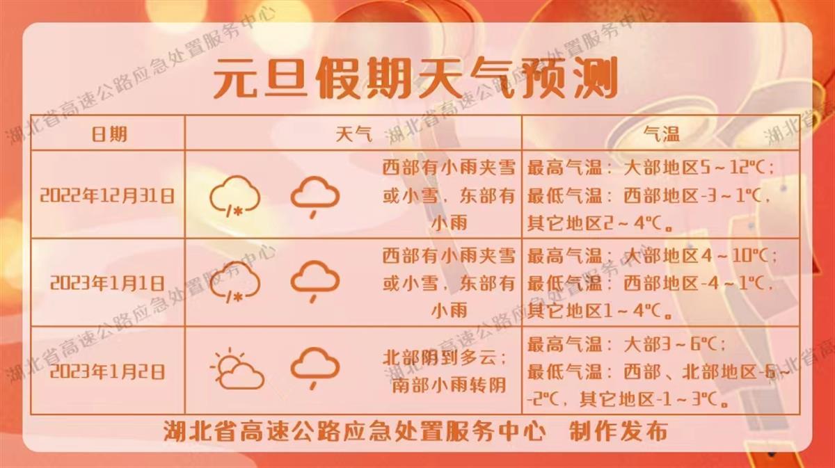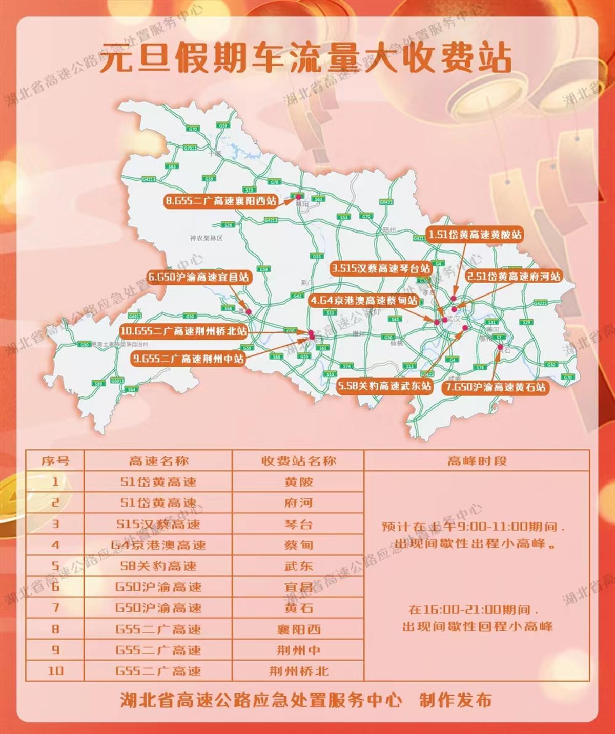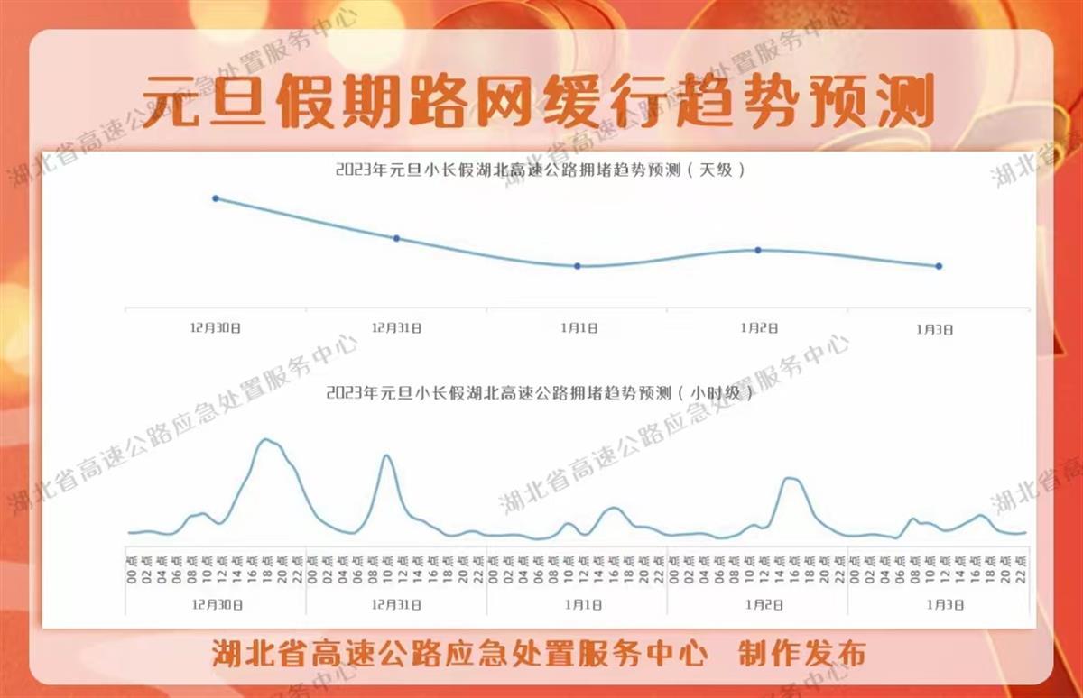路网整体流量方面,根据对往年路网运行数据分析,结合近期湖北省高速路网运行实际,预计2023年元旦假期期间高速路网出入口日均车流量,较2022年日常流量上升37.5%。建议广大公众做好出行规划,错时、错峰出行,合理安排出行线路,避开拥堵路段。