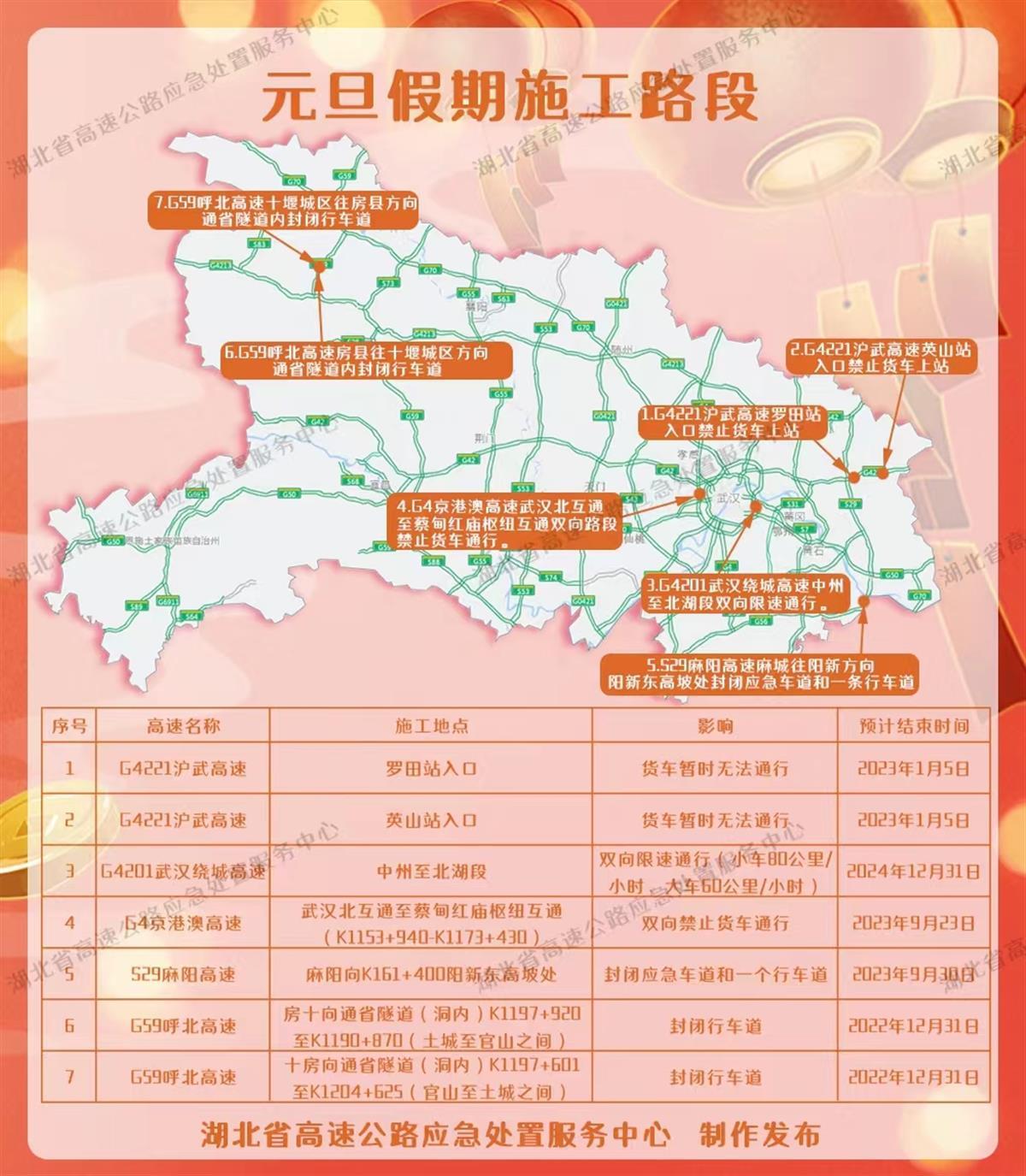 元旦假期,全省高速公路国高网主干线共有7处施工点。提示广大司乘,车辆在通过施工路段时请注意交通标志标牌信息,减速慢行,防范前方车辆急刹车、突然变道等情况,遵守交通规则,文明行车,有序通过施工路段。途经G4京港澳高速武汉北至蔡甸段的货车可绕行S40武汉四环线。