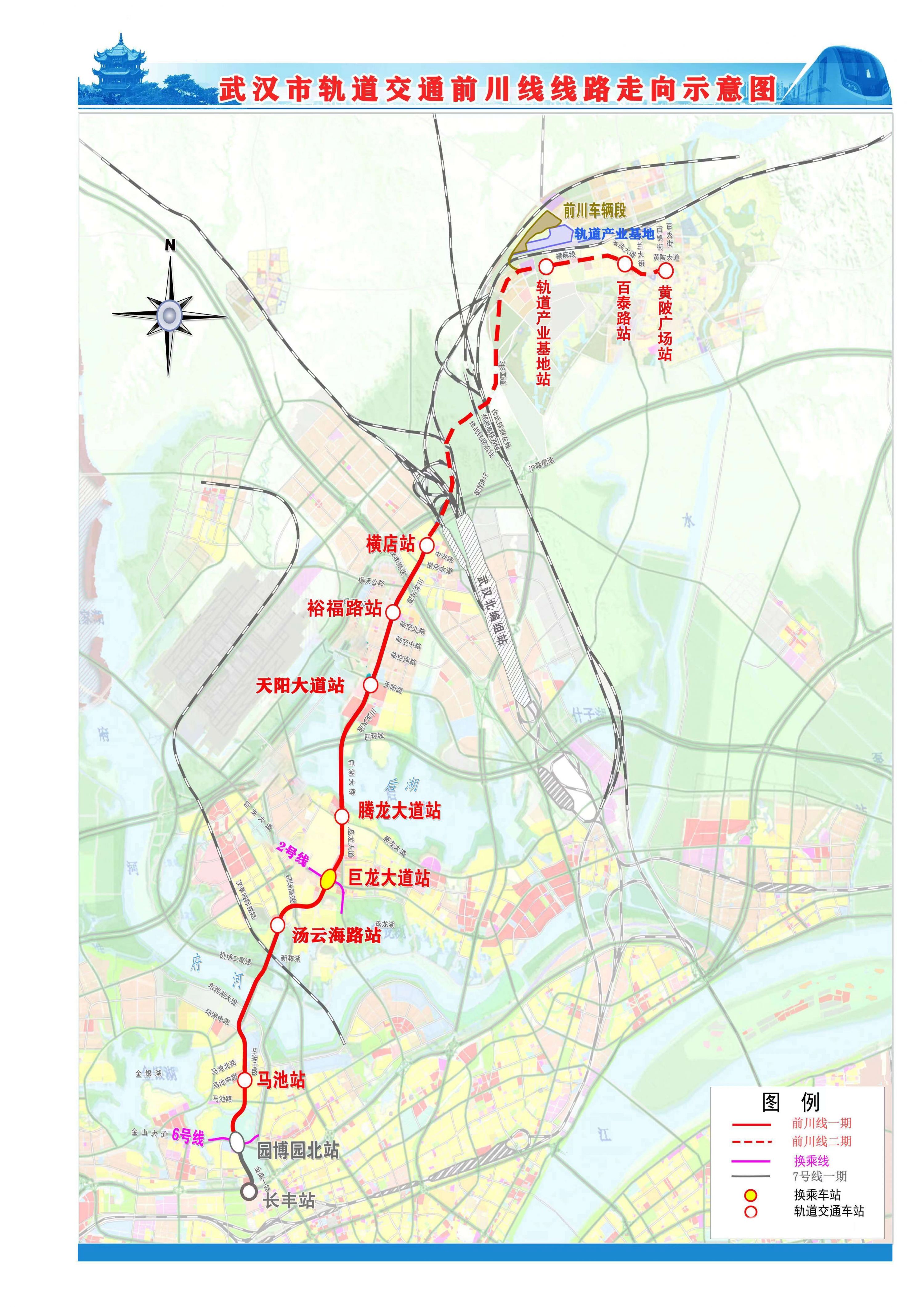 前川线工程(一期)全长21.1公里,起于7号线园博园北站,沿环湖中路、盘龙大道、川龙大道等主干道走行,设马池站、汤云海路站、巨龙大道站、腾龙大道站、天阳大道站、裕福路站、横店站共7座车站。前川线一期与7号线贯通运营后,全线成为连接北部新城组群、汉口中心城区、武昌中心城区、南部新城组群的市域快线,成为一条重要的客运交通走廊。