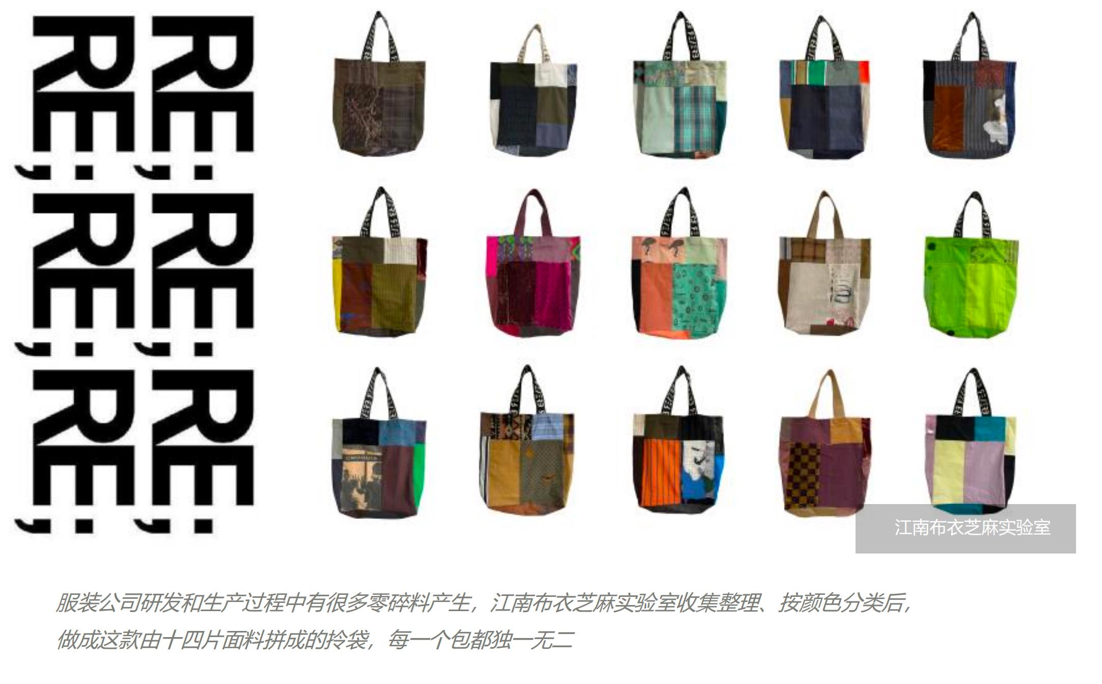 《布尽其用材料趋势白皮书》中呈现的“十四片拼布包”就是江南布衣的“芝麻实验室”推出的产品之一,主体部分选取公司研发和生产过程中产生的零碎面料,根据不同颜色分类组合,拼接制作成包。这样的方式既最大程度减少了损耗,同时也让每一只拼布包都独一无二。