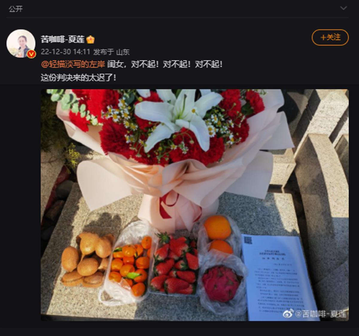 12月30日下午2时11分,江秋莲在微博发文:“闺女,对不起!对不起!对不起!这份判决来得太迟了!”。据悉,江秋莲在接到电子版判决书后,即前往江歌的墓地。她表示,自己要和江歌一起看判决结果。
