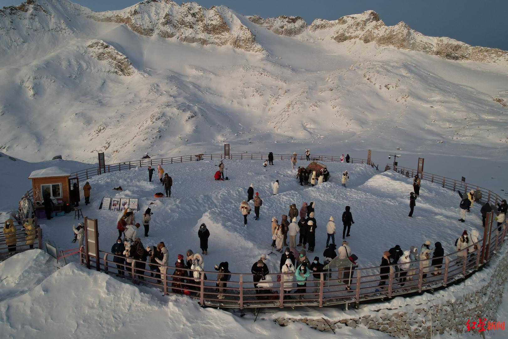 ↑游客在达古冰川海拔4860米平台,迎接新年第一缕曙光