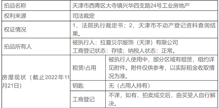 值得注意的是,该资产内共包含5幢工业厂房,其中2幢较为特殊,评估报告称,2幢总高2层,现出租用作售楼处,因租户原因,无法入内查勘(带租约整体拍卖)。拍卖页面显示,截至2022年11月21日,该资产被拉夏贝尔天津公司使用中,部分区域有租赁,法院、拍卖辅助机构无钥匙,钥匙被占用人持有中。