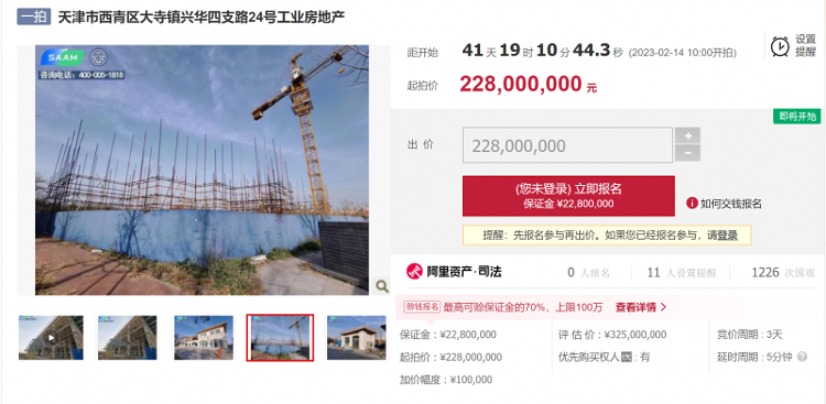 近日,曾被称为“女装之王”的拉夏贝尔名下一处资产将被司法拍卖,引发网友关注。记者登录阿里法拍官网了解到,此次拍卖为拉夏贝尔全资子公司拉夏贝尔服饰(天津)有限公司所持有的位于天津市西青区大寺镇兴华四支路24号工业房地产,起拍价为2.28亿元,加价幅度为10万元。目前,这起拍卖已经吸引1226人围观,11人设置提醒,但目前还无人报名。