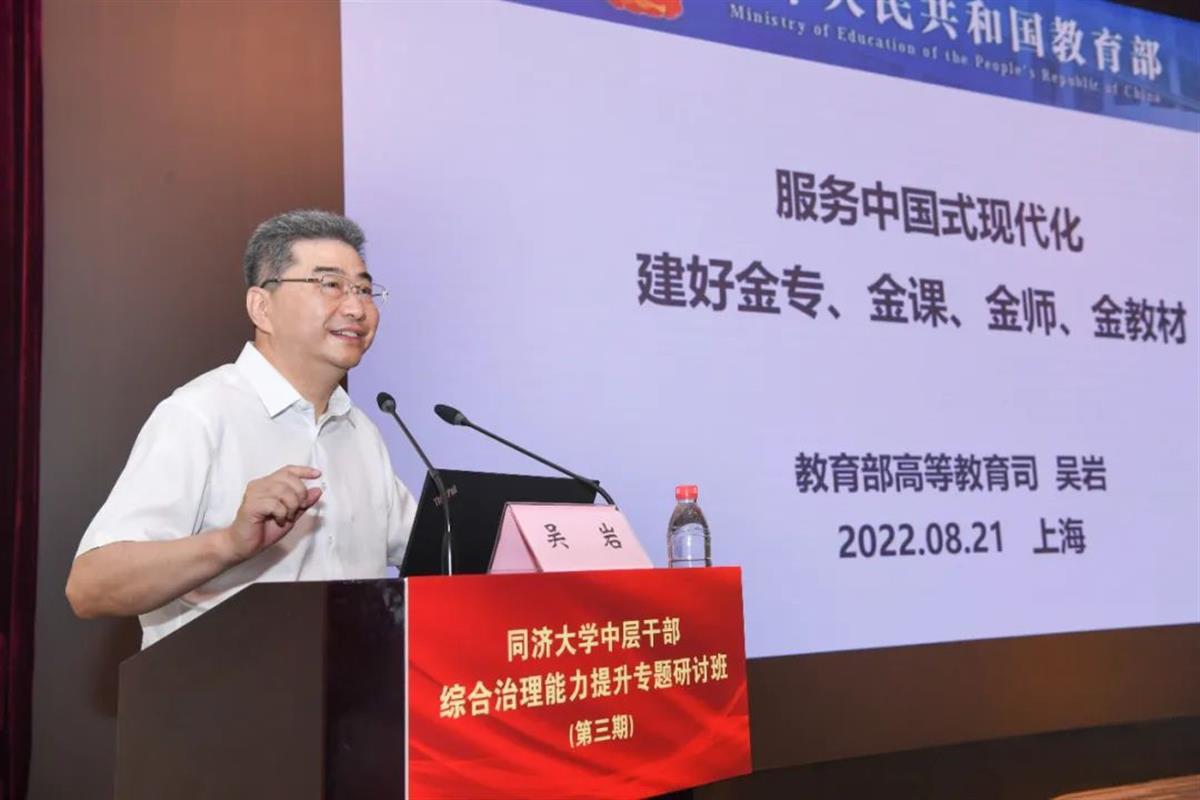 值得注意的是,2014年,吴岩受聘为同济大学校兼职教授。吴岩和陈杰也曾一起在同济大学出席活动。2022年8月21日,同济大学中层干部综合治理能力提升专题研讨班(第三期)圆满落下帷幕。教育部高等教育司司长、同济大学兼职教授吴岩应邀来校作了题为《服务中国式现代化,建好金专、金课、金师、金教材》的主旨报告。时任同济大学校长陈杰等全体校领导出席结业仪式。