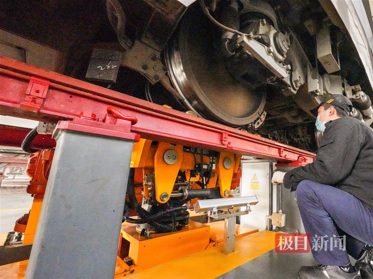 除了列车车厢内设施设备的检修,另一个更重要的任务也在同时进行——车轮探伤。走出车厢来到车下,记者看到机械师毛柯和同事正在忙碌。