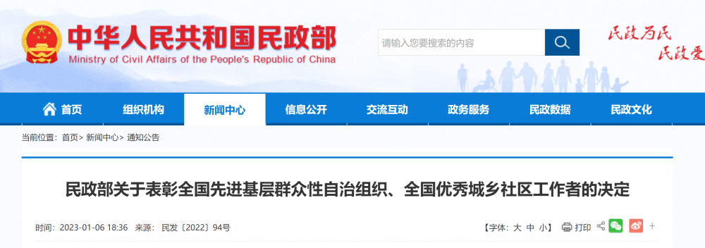 近日,民政部授予北京市西城区广安门外街道天宁寺南里社区居民委员会等200个组织“全国先进基层群众性自治组织”称号,授予金坤范等496人“全国优秀城乡社区工作者”称号。其中湖北省武汉市东湖生态旅游风景区东湖新城社区居民委员会等7个村(居)民委员会获得“全国先进基层群众性自治组织”称号,武汉市青山区工人村街道青和居社区党委书记、居民委员会主任桂小妹等18名社区工作者获得“全国优秀城乡社区工作者”称号。