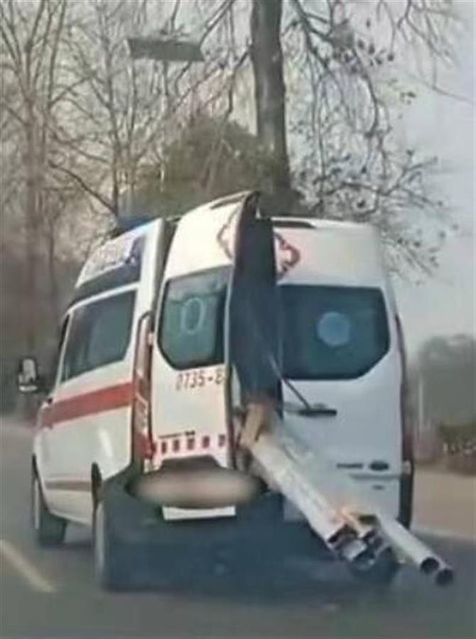 网传视频显示,一辆车身喷有“郴州市德田医院”字样的救护车正在马路上行驶,但救护车后门打开,几根钢管伸出。视频显示,救护车的急救灯也在不停闪烁。