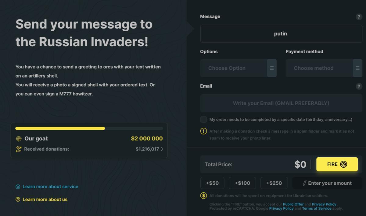 这一众筹项目被发布在一个名叫“为我的火箭签名”的网站上。买家可以输入“想对俄罗斯人说的话”,然后选择付款方式,就可以选择一款乌克兰武器,从炮弹到“米格—29”战斗机,根据不同的选择需要支付不同的价格。