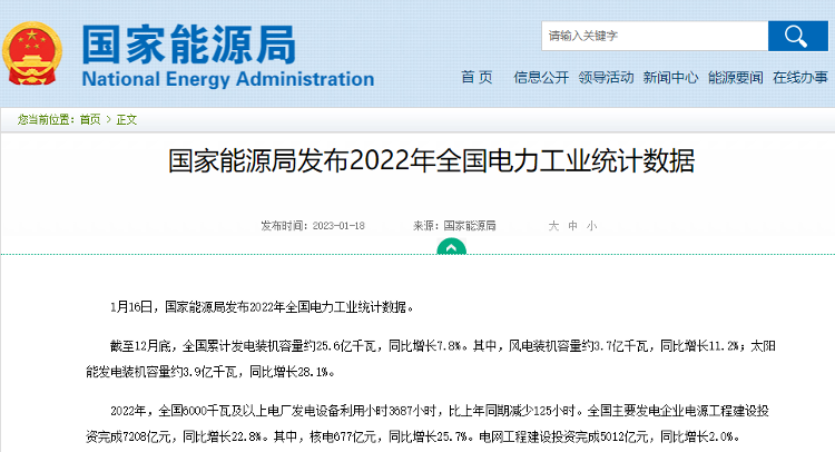 国家能源局:2022年全国累计发电装机容量约25.6亿千瓦,同比增长7.8%