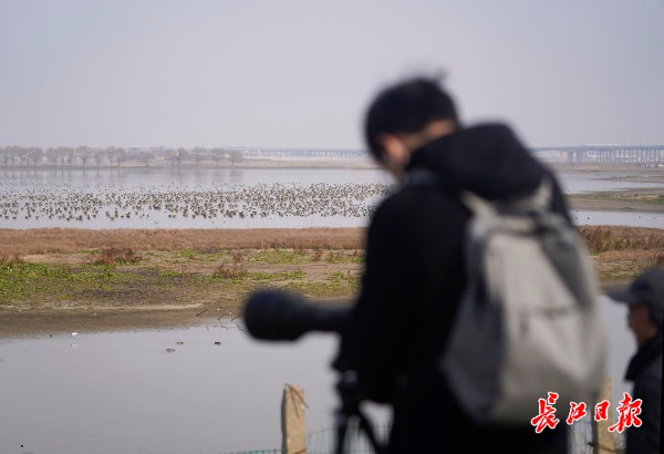 1月27日,府河湿地的瞭望平台上,几位小朋友在一位老师的带领下边观鸟边学习候鸟的迁徙知识。 长江日报记者彭年 摄