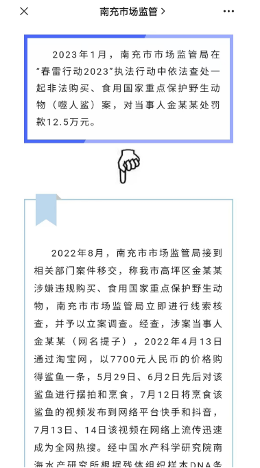 2022年7月14日,四川南充百万粉丝网红“提子”金某某发的水煮和烧烤鲨鱼视频引发关注。经鉴定,这条鲨鱼是国际濒危野生动物噬人鲨,为国家二级保护动物。2023年1月29日,封面新闻记者从南充市场监督管理局获悉,依法给予当事人金某某处罚款12.5万元。