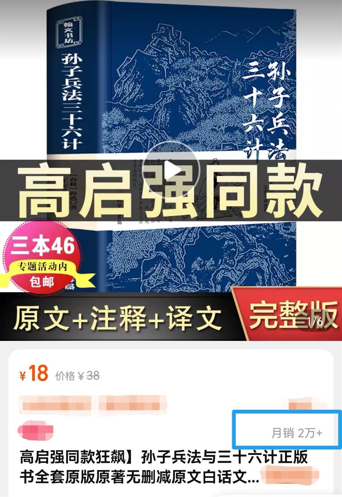 近日,《孙子兵法》相关书籍在某电商平台霸榜热搜第一,很多商家都在商品中标注了“狂飙同款”等字样,甚至把剧中的片段放在商品图集的开头用于宣传。极目新闻记者了解到,有商家店铺内的《孙子兵法》在短短2天月销量增加了近1万单,现在月销量已破2万单。