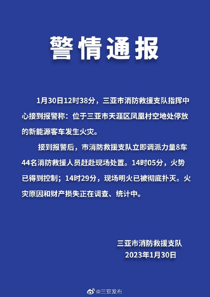 据@三亚发布 微博消息,三亚市消防救援支队发布警情通报,1月30日12时38分,三亚市消防救援支队指挥中心接到报警称:位于三亚市天涯区凤凰村空地处停放的新能源客车发生火灾。