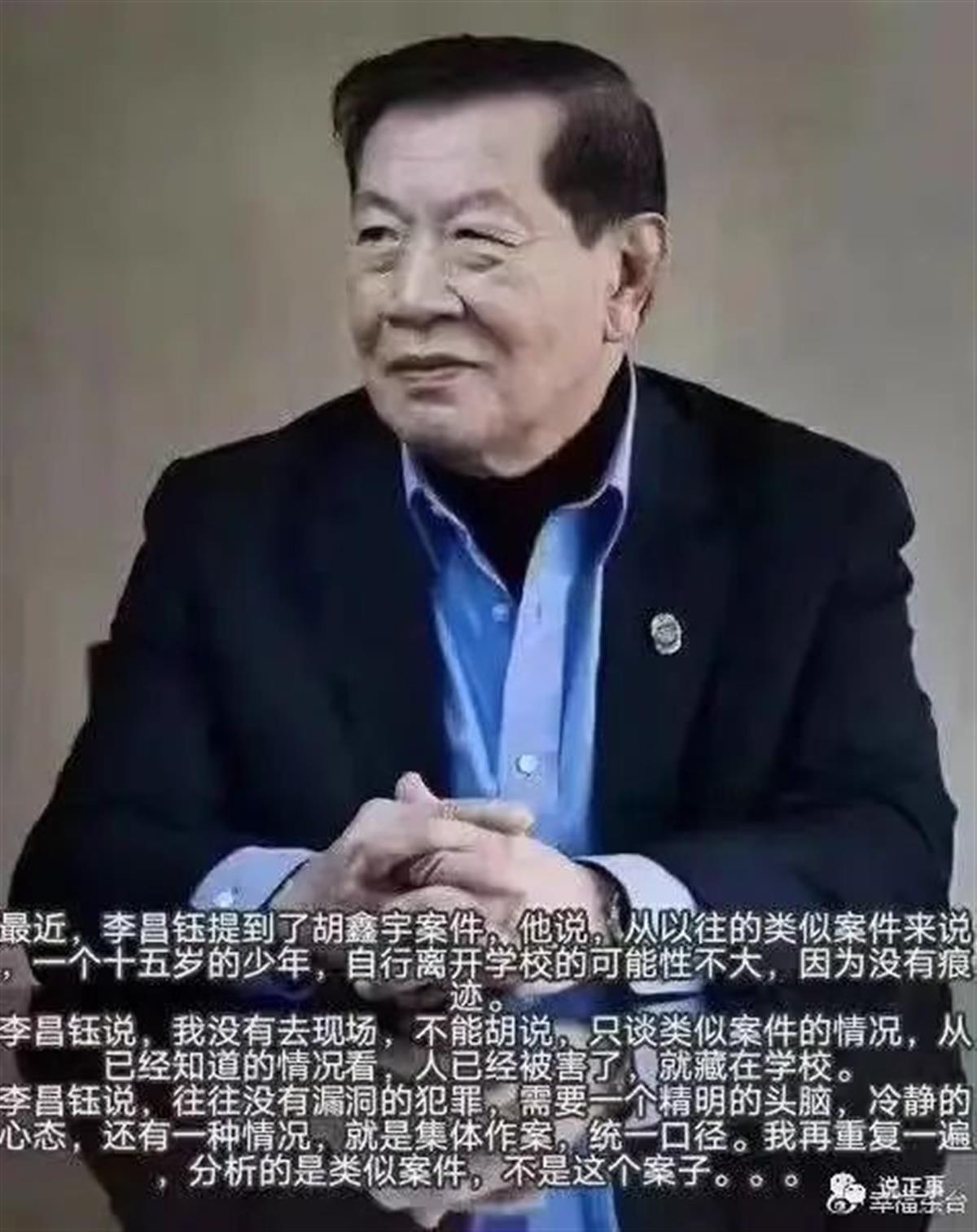 有网传信息称,李昌钰接受采访时推断胡鑫宇已经遇害,尸体被溶解藏匿,是多人集体作案,并统一口径守口如瓶。在胡鑫宇失踪后,这则消息曾陆续以不同版本在网上流传过。