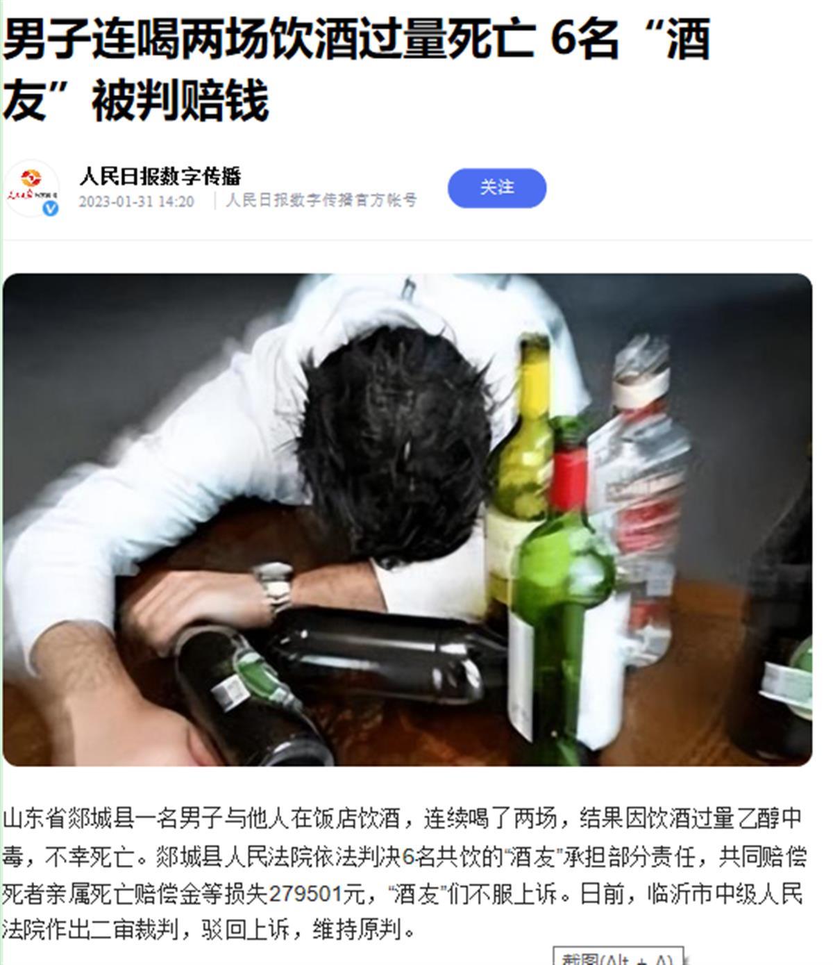 近日,山东省临沂市郯城县一名男子连续喝了两场酒之后,因饮酒过量乙醇中毒,不幸死亡,6名共饮的“酒友”被判共同赔偿死者亲属死亡赔偿金等损失279501元。“酒友”们不服上诉,近日,临沂市中级人民法院作出二审裁判,驳回上诉,维持原判。(据1月31日人民日报客户端)