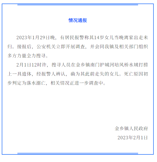 据“金乡发布”最新通报,2月1日12时许,搜寻人员在温州市苍南县金乡镇南门护城河培风桥水域打捞上一具遗体,系1月29日晚居民报警走失的14岁女孩。死亡原因初步判定为落水溺亡,相关情况正进一步调查中。