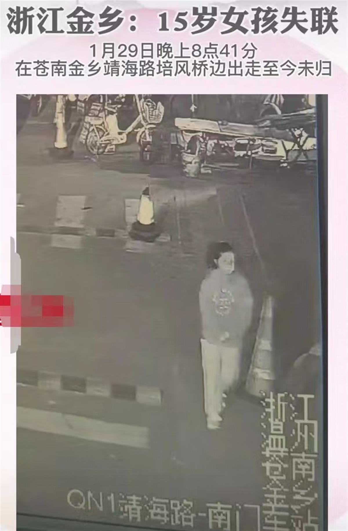 网传的寻人启事显示,该女孩15岁,于1月29日晚8时41分在浙江温州苍南县金乡镇靖海路培风桥边出走,至今未归。女孩身高152厘米,戴眼镜,出走当天身穿军绿色卫衣、天蓝色睡裤、米白色运动鞋。