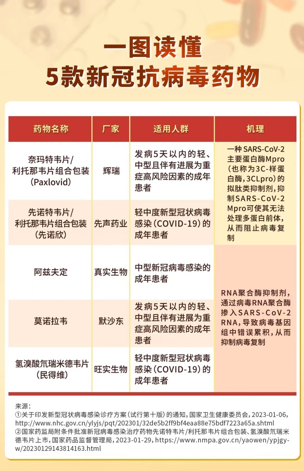 据人民日报健康客户端记者梳理,目前国内已经获批上市的新冠口服药共有5款,包括3款国产新冠口服药和2款进口新冠口服药,初步形成了“3(国产)+2(进口)”市场格局。分别为真实生物的阿兹夫定、旺实生物的氢溴酸氘瑞米德韦片(商品名称:民得维)、先声药业的先诺特韦片/利托那韦片组合包装(商品名称:先诺欣)、辉瑞的Paxlovid以及默沙东的莫诺拉韦胶囊(Molnupiravir)。
