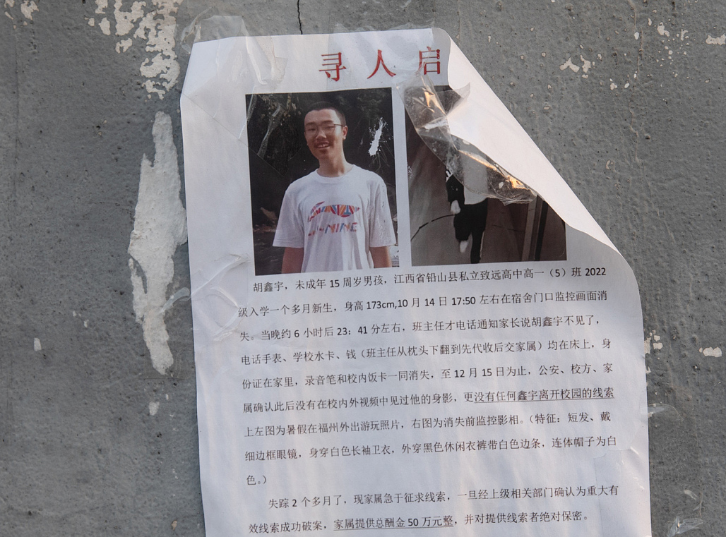 2023年1月30日,江西上饶,铅山县致远中学,校门外不远处的围墙上还粘贴着胡鑫宇的寻人启事。