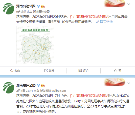 此前,湖南高速公路公布的路况信息显示,2月4日17时19分,许广高速长湘段望城收费站附近以北K674处南往北因多车追尾造成交通通行缓慢,17时50分因处理事故车辆双向实行交通管制,20时南往北方向车辆分流至乌山枢纽绕行,至23时31分事故点明火已扑灭。