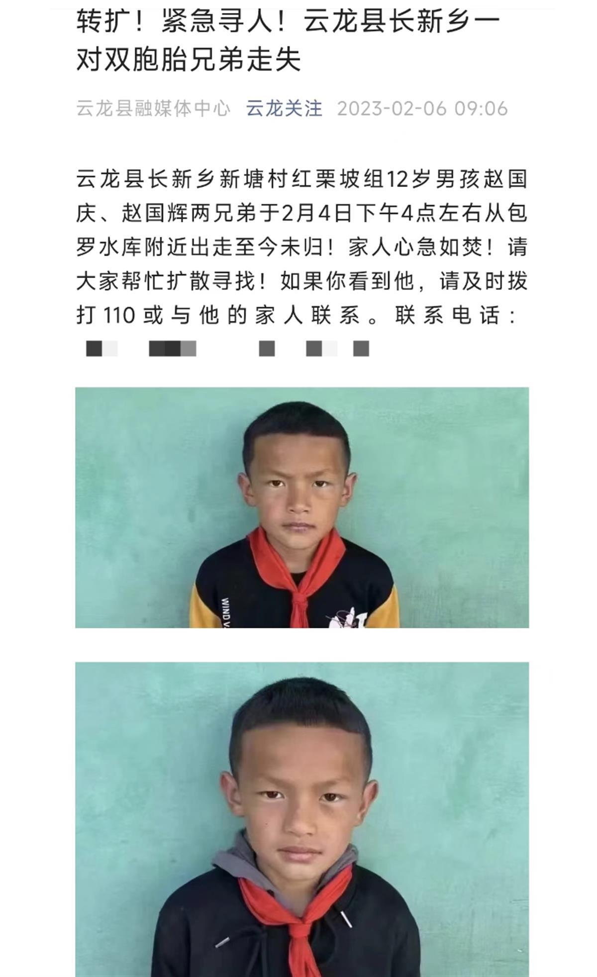 赵婷介绍,两个弟弟是双胞胎,今年12岁,身高1.5米左右,两人体型偏瘦,体重均不足70斤。“我们找了他们可能走丢的地方,也找了整个村子,还是没有找到。”赵婷说,事发后,家人已向当地警方报警。