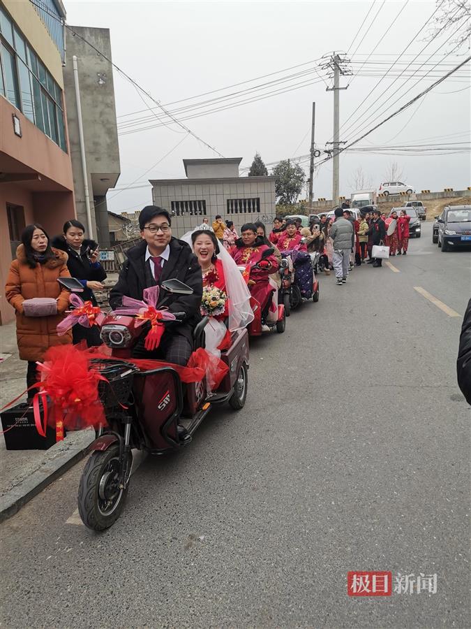 上午11时许,按照农村传统婚礼习俗,在亲友的见证下,胡鹏辉将一袭婚纱的湛正薇抱上老年代步车后排,喜庆热闹的场面赢得在场亲友的连连掌声。锣鼓声敲响,胡鹏辉驾驶头车,带领车队出发。