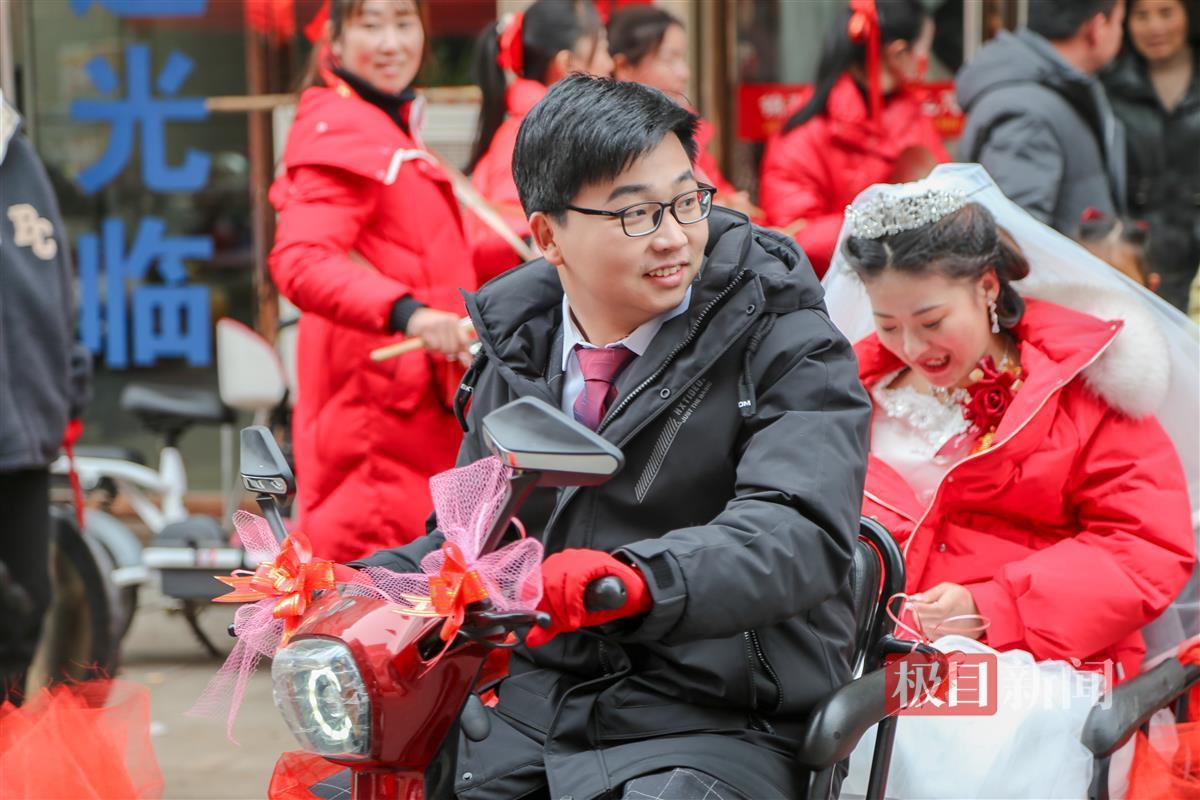 一大早,胡鹏辉便换上西装,领着腰鼓队来到湛正薇家娶亲。没有名车组成的娶亲豪华车队,13辆电动车装扮得喜气洋洋,胡鹏辉和湛正薇的脸上挂满了幸福的笑容。
