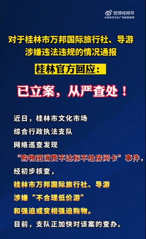 @桂林市文化广电和旅游局 微博2月8日消息,对于桂林市万邦国际旅行社、导游涉嫌违法违规情况,桂林官方回应:已立案,从严查处。经初步核查,桂林市万邦国际旅行社、导游涉嫌“不合理低价游”和强迫或变相强迫购物。目前,正加快对该案的查办。
