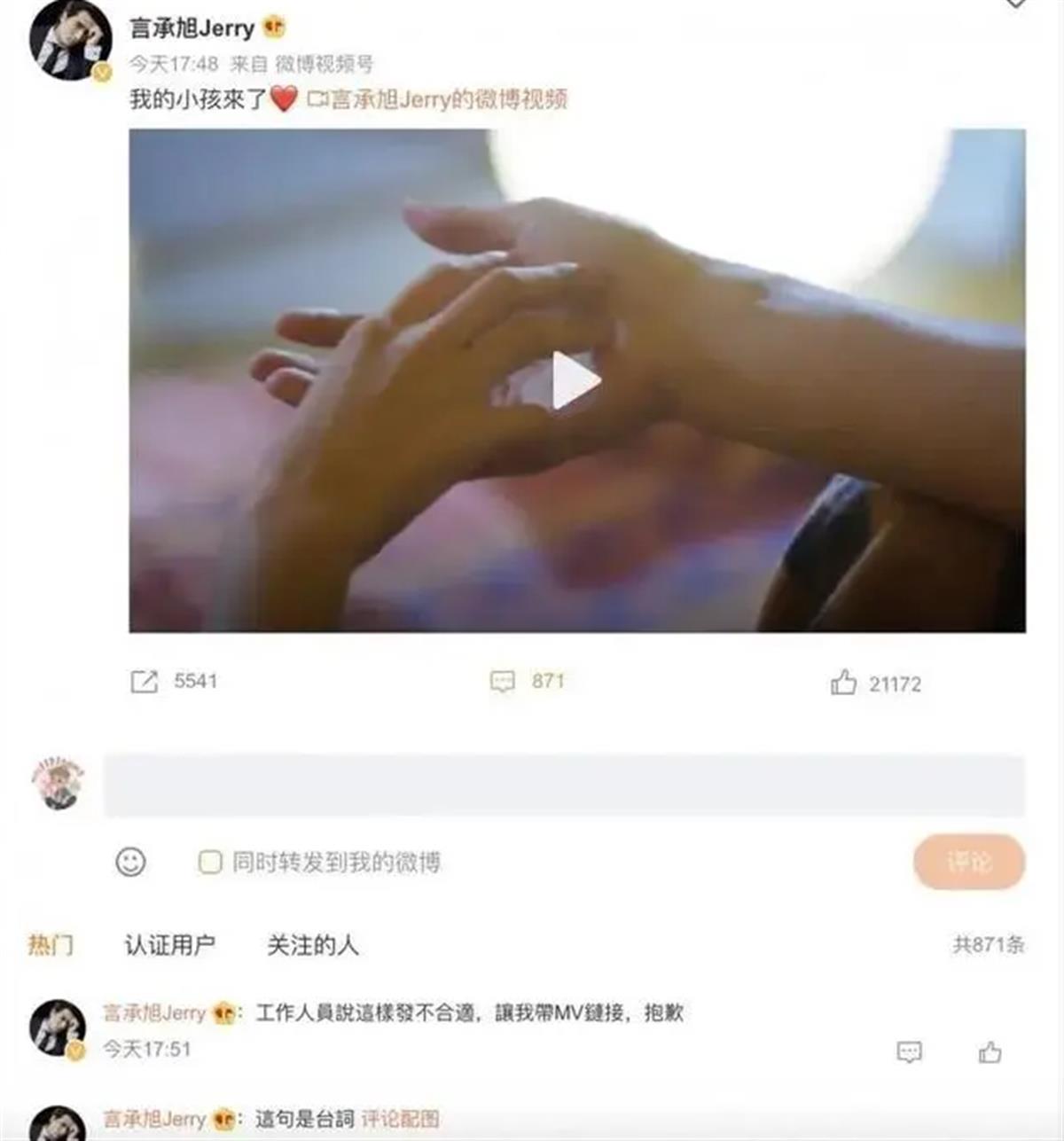 言承旭发布的新剧宣传片,在回复中称“抱歉”