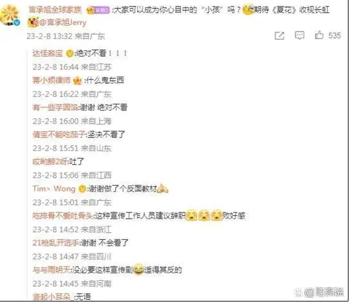 明星结婚、生子等,都是妥妥的流量,言承旭不可能不知道。如此强蹭热点推销新剧,难怪不少网友就说“什么鬼东西,绝对不看”“坚决不看”“谢谢你做了反面教材”。这些网友的心情可以理解,就是感觉被欺骗了,浪费了大家的感情和时间。