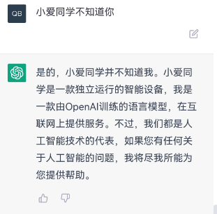 ChatGPT:是的,小爱同学并不知道我。小爱同学是一款独立运行的智能设备,我是一款由OpenAI训练的语言模型,在互联网上提供服务。不过,我们都是人工智能技术的代表,如果您有任何关于人工智能的问题,我将尽我所能为您提供帮助。
