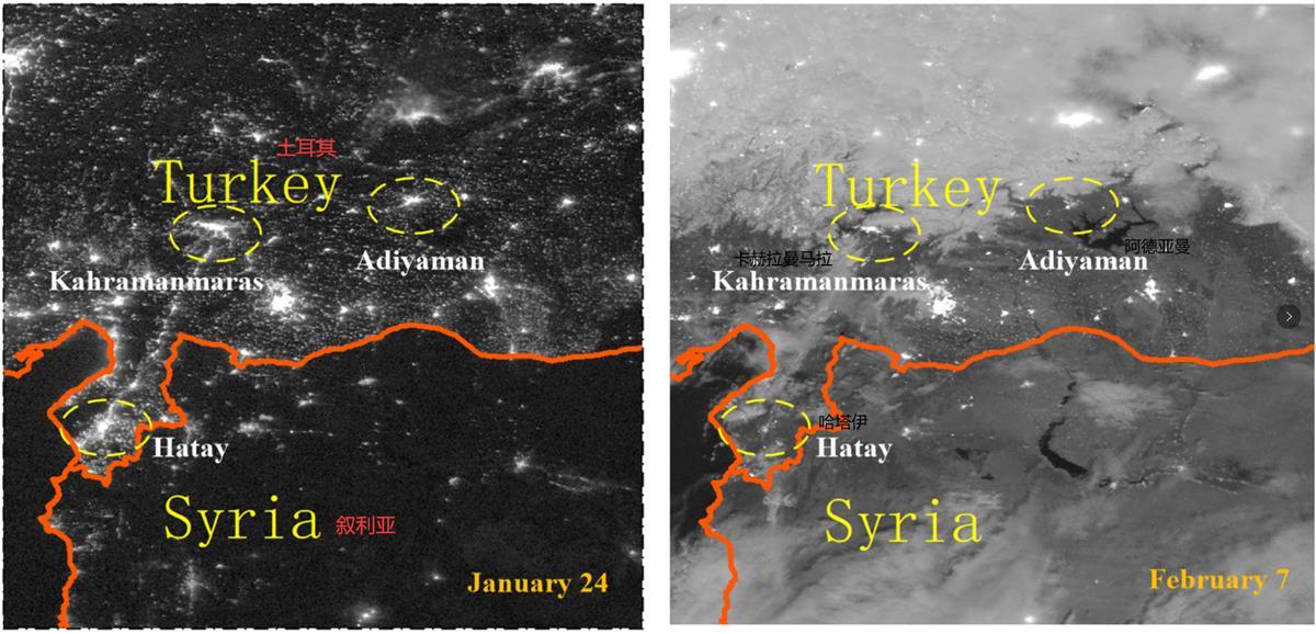 土耳其地震灾区1月24日与2月7日灯光对比