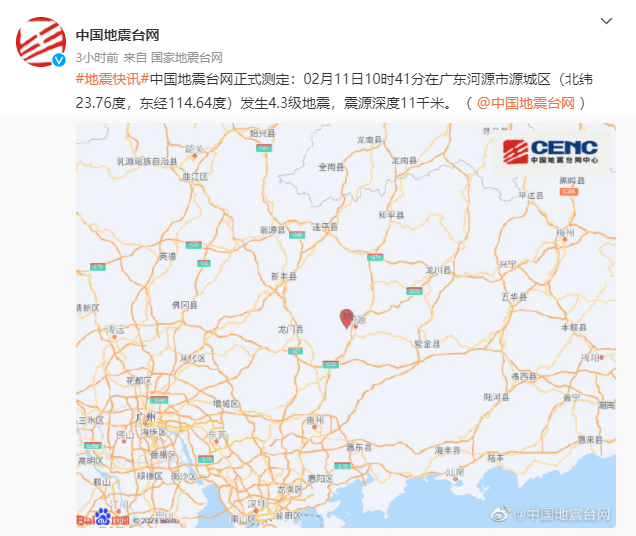 现代快报讯(记者李娜)据中国地震台网正式测定:2月11日10时41分在广东河源市源城区(北纬23.76度,东经114.64度)发生4.3级左右地震,震源深度11千米。当天14时39分在甘肃酒泉市瓜州县发生2.9级地震,震源深度11千米。此前两天,青海、西藏、新疆等三地发生了3.0级地震。不少网友不禁联想:近期国内多地接连发生地震,这些地区是不是跟土耳其在一个地震带上?跟土耳其地震有没有关系?