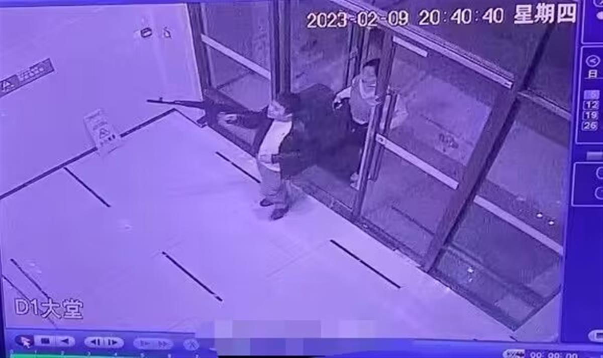 在网友配发的监控截图中,在居民楼一楼的入户大厅,一名男子举着一把“长枪”,后面跟着一名女子,显示时间为2月9日晚上8时40分。另外的图片中,有猫躺在地上。