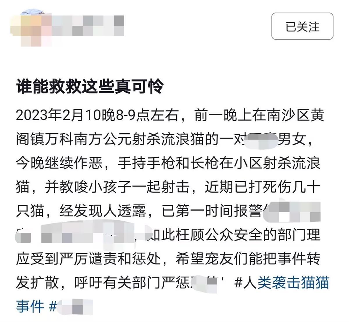 多个社交平台上有网友发文称,近日,广州市南沙区黄阁镇万科南方公元小区,一对男女手持“手枪和长枪”射杀流浪猫,并教唆小孩子一起射击,近期已打死打伤几十只猫。