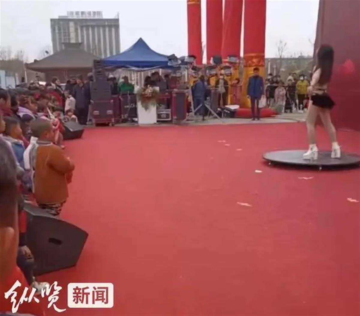 舞台上是衣着暴露的女子表演钢管舞,舞台背景是县政府以及多个相关职能部门的名称,而台下又有不少儿童,这种反差让人尤其刺目。