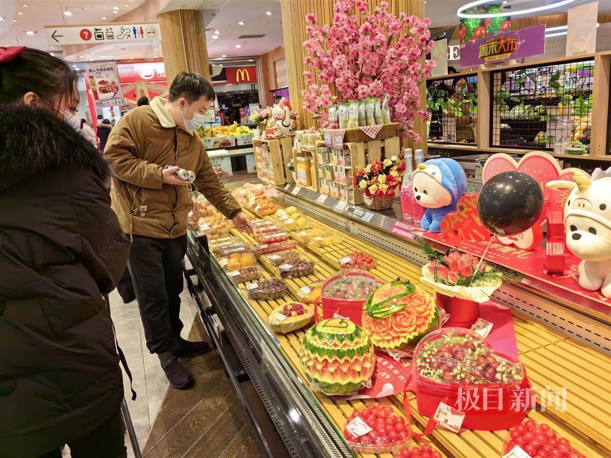 2月13日,情人节前一天,汉口金桥大道的一座连锁超市里,水果区摆起了多个造型各异的“蔬果礼花”,吸引了进门的消费者驻足观赏看稀奇。
