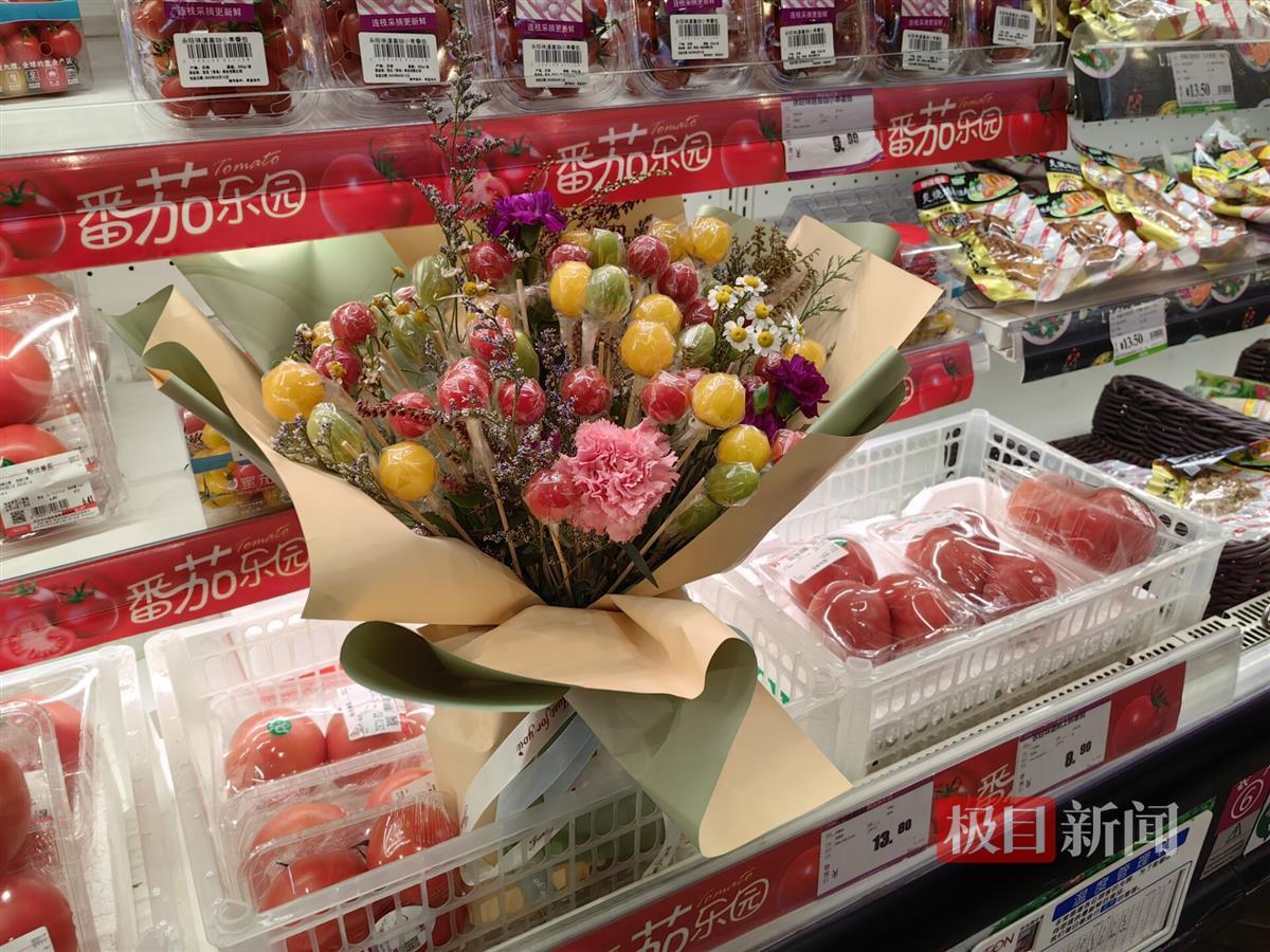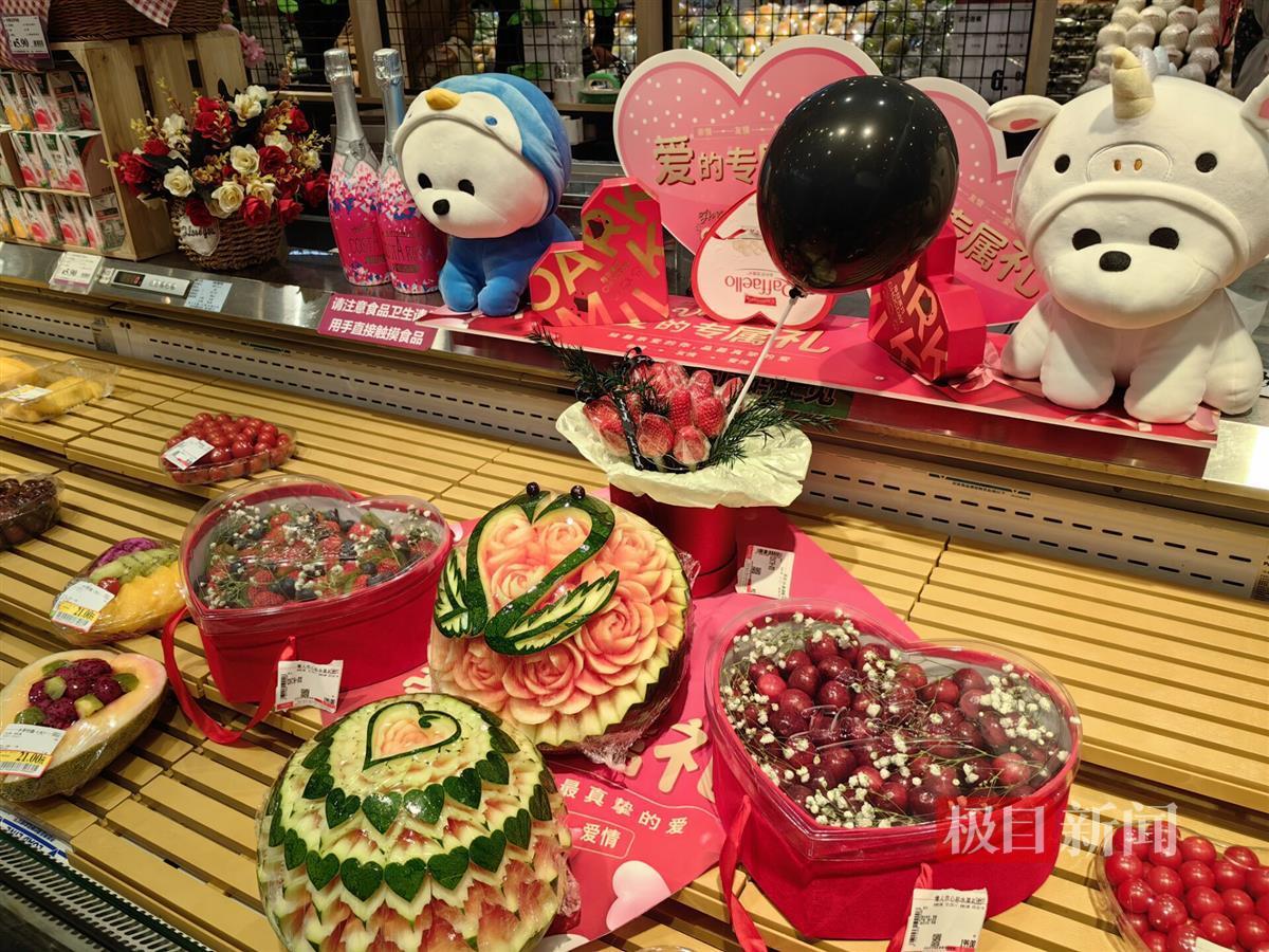2月13日至14日,极目新闻记者走访发现,由于当下正是吃草莓、樱桃等春季水果的时令季节,部分超市、水果卖场,以及花店、农庄等市场里,专门把各种水果、蔬菜制作成手捧花、心形盒,以及其他特殊爱心造型,在情人节档期里吸引消费者。