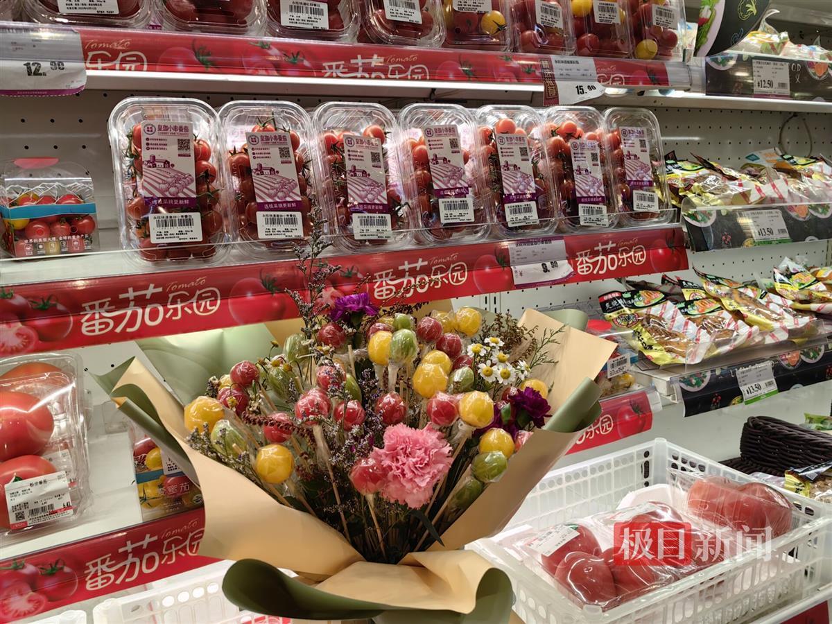“以前只看到过用草莓做的情人节鲜花,没想到现在用来做花的水果这么多,真是蛮花心思啊!”两位夫妻模样的年轻人推着购物车,在展示柜旁看着,似乎对一款用各种小番茄做成的“情人节花束”特别感兴趣:“五颜六色的挺有意思,颜色足,样子还蛮萌。” 记者注意到,这是一束由红色、黄色、橘色、青绿色等四种颜色的水果小番茄组成的花束,同时,搭配了各种不同色彩的花花草草,以及装饰物,看上去既显得可爱,又有鲜花、鲜果的浪漫。