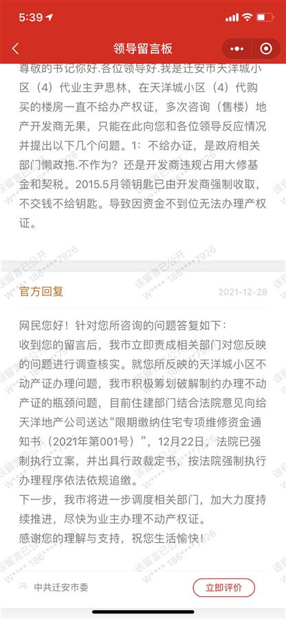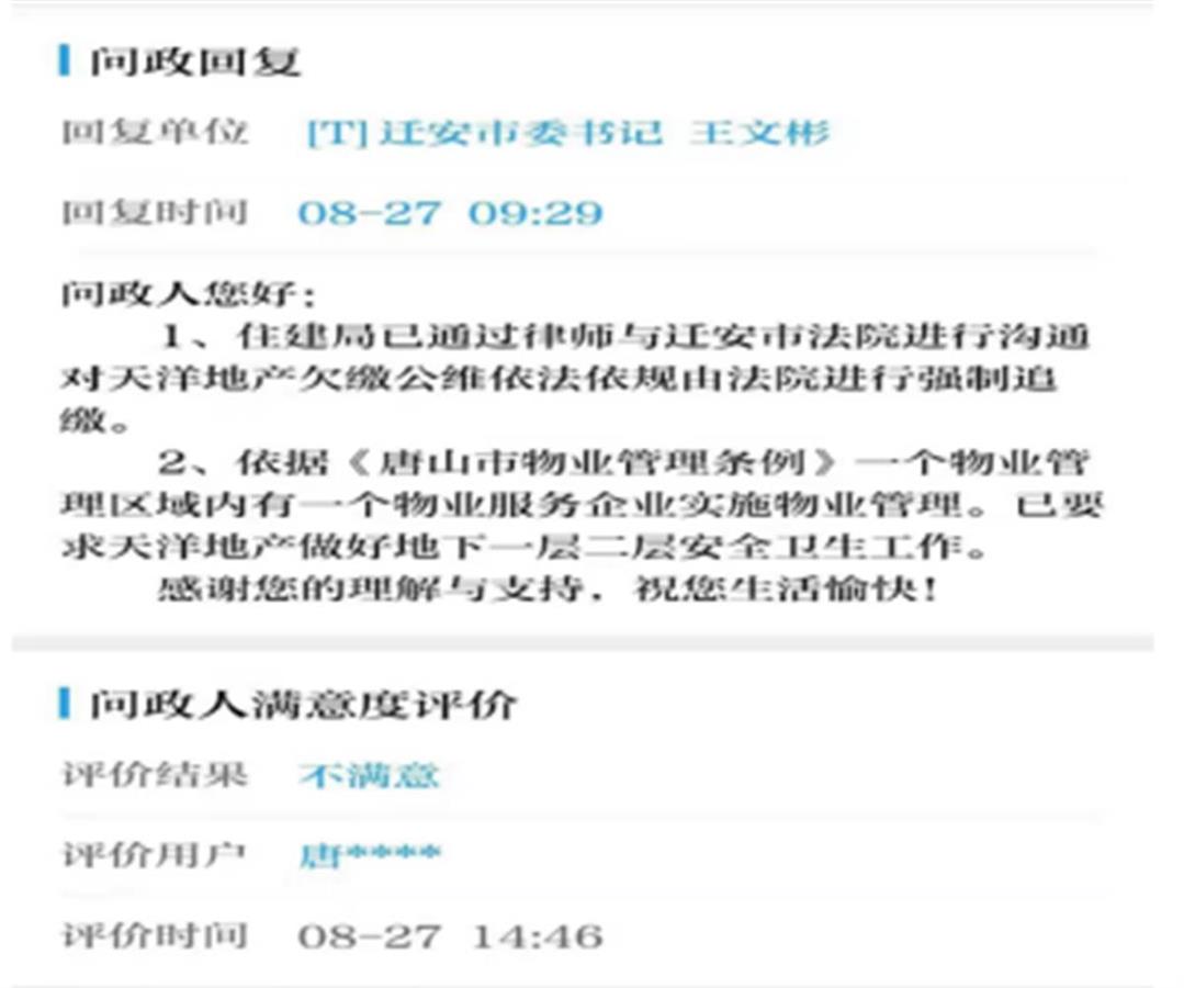 去年8月,小区业主们曾在政府平台反映办证诉求,官方回复:住建局已通过律师与迁安市法院进行沟通,对天洋地产欠缴公维依法依规由法院进行强制追缴。