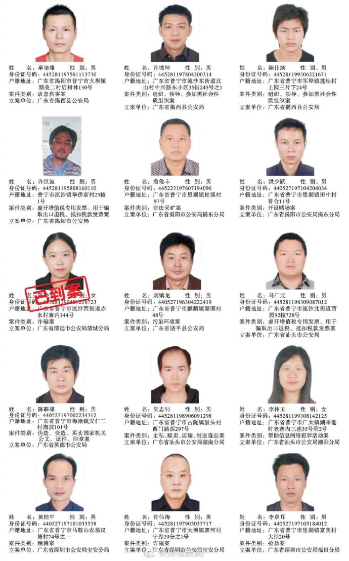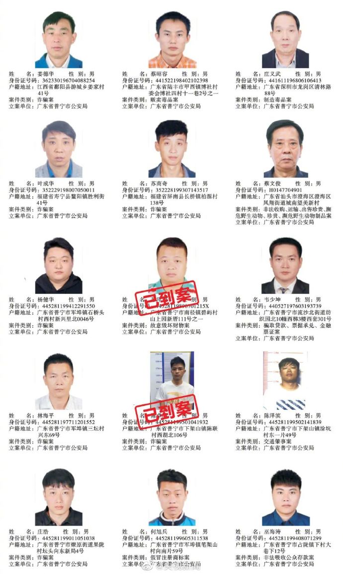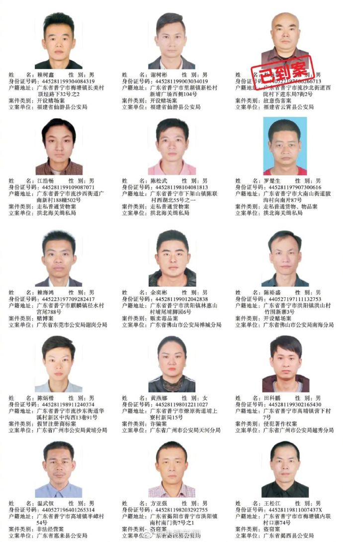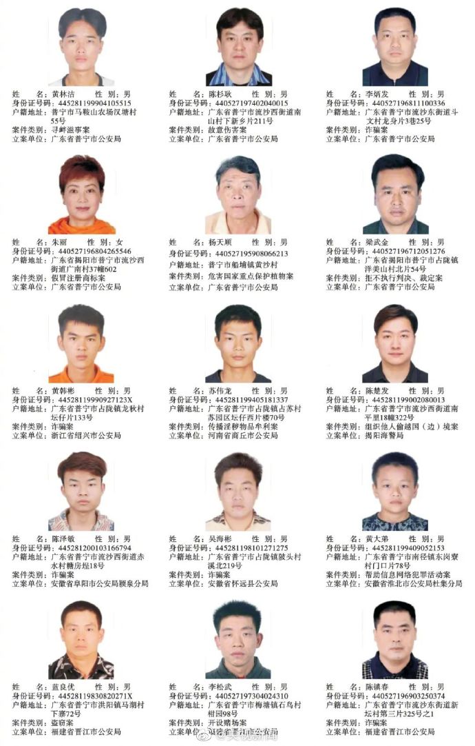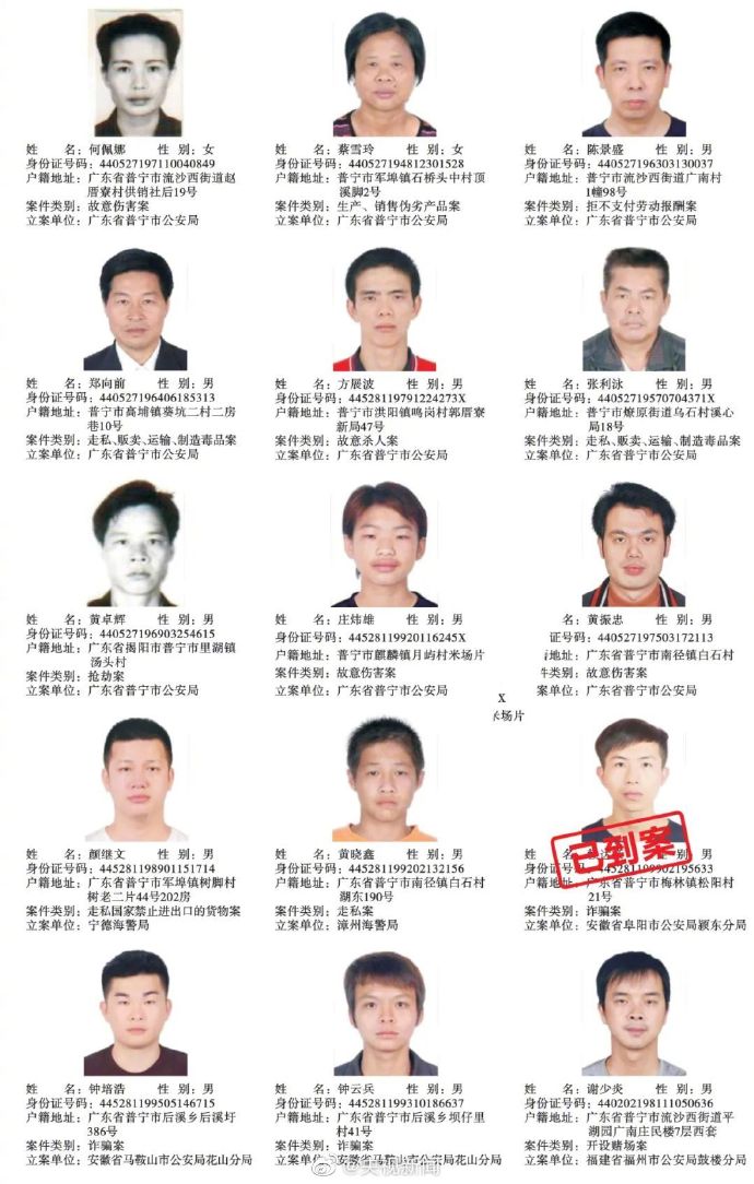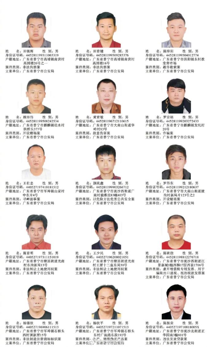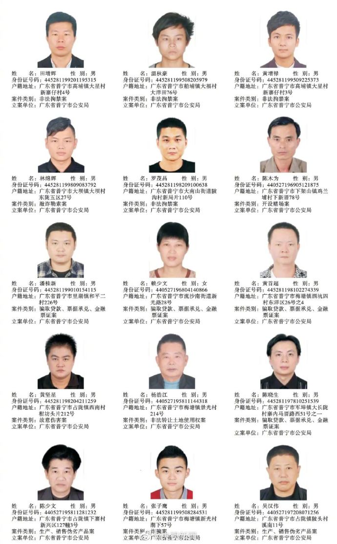 广东普宁公布200余悬赏通缉犯照片,每抓1人奖励5千元