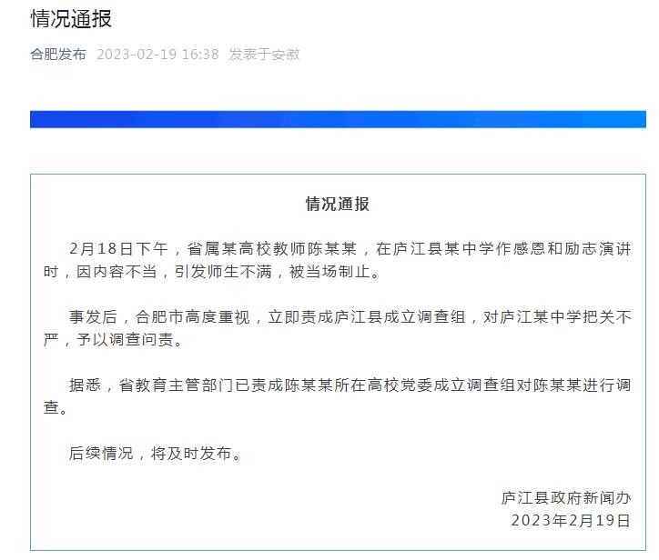 2月18日下午,省属某高校教师陈某某,在庐江县某中学作感恩和励志演讲时,因内容不当,引发师生不满,被当场制止。